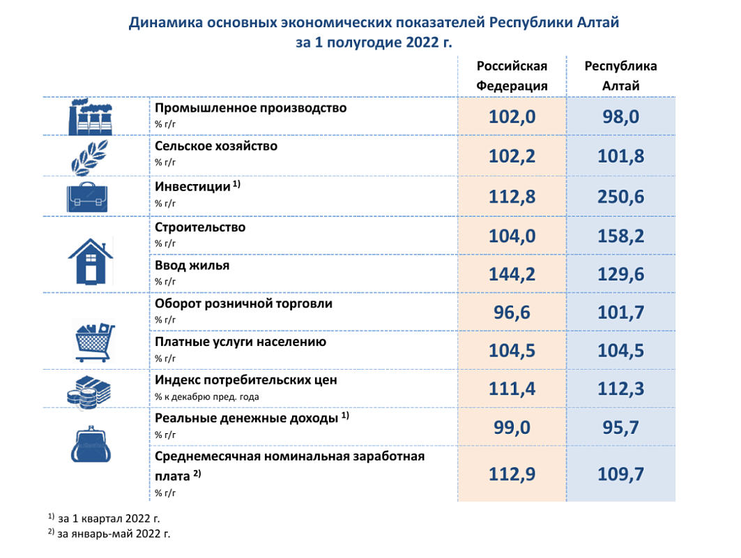 Динамика основных экономических показателей Республики Алтай за 2 квартал 2022 года