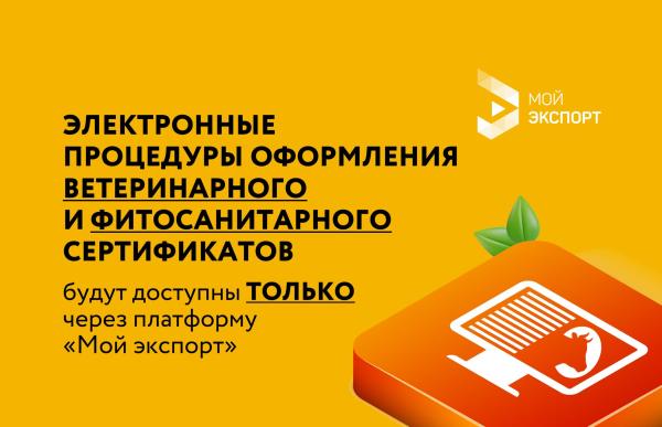 С 3 июля 2023 г. заявления в электронной форме на оформление фитосанитарного, в том числе реэкспортного, сертификата и с 1 сентября 2023 г. заявления в электронной форме на оформление экспортного ветеринарного сертификата и разрешения на вывоз подконтрольной продукции будут подаваться исключительно с использованием платформы «Мой экспорт».