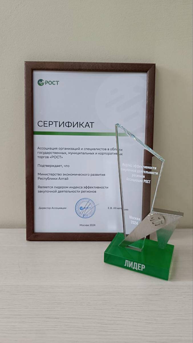 Министерство экономического развития Республики Алтай награждено как лидер эффективности закупочной деятельности по показателю «Доля заключенных контрактов с субъектами малого предпринимательства».