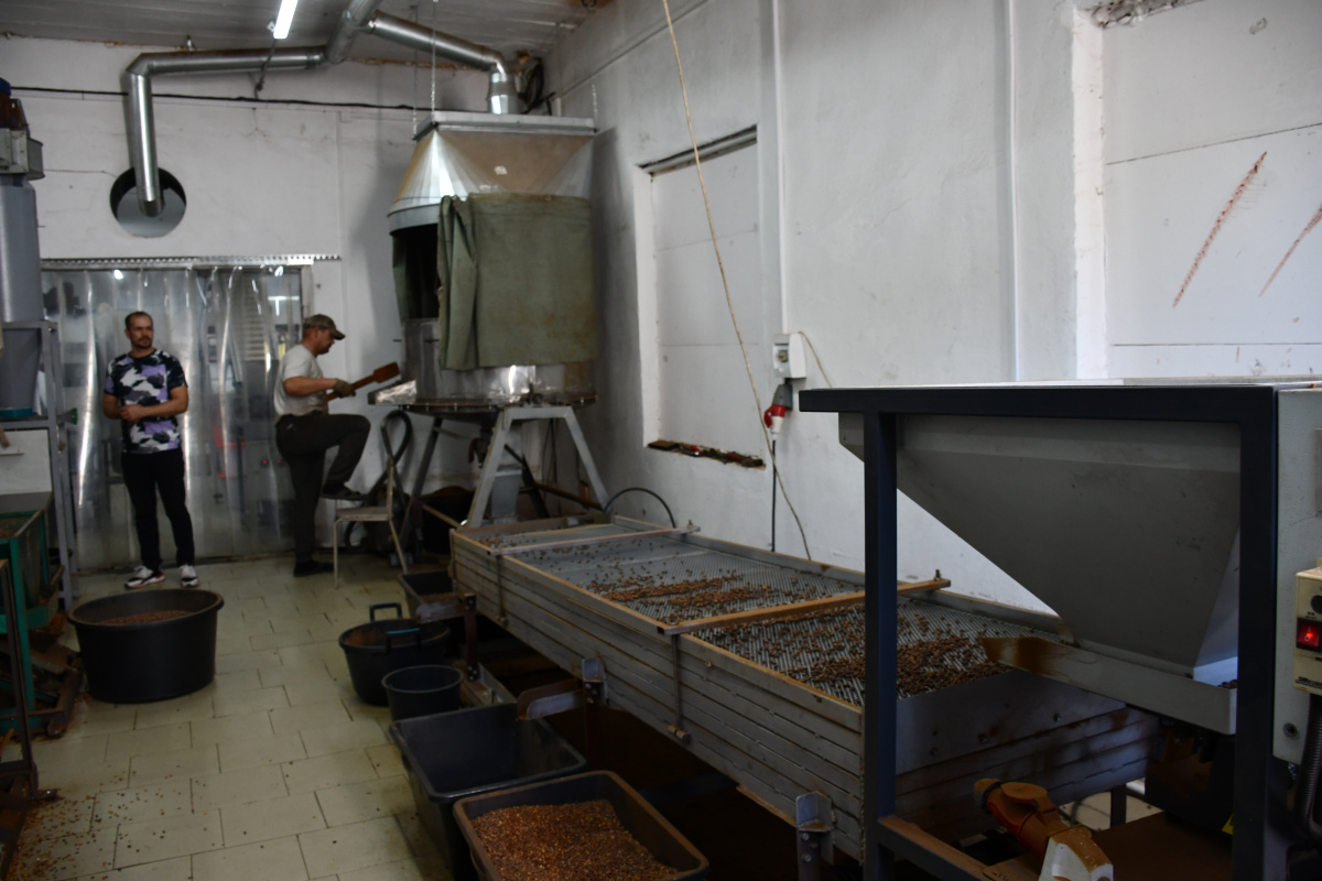 На предприятии «Дары Гор Алтая» осуществляется полный цикл переработки ореха. В начале процесса используется рушилка для шишки, полученный орех сушится в специальных емкостях и далее осуществляется калибровка ядра по цвету.