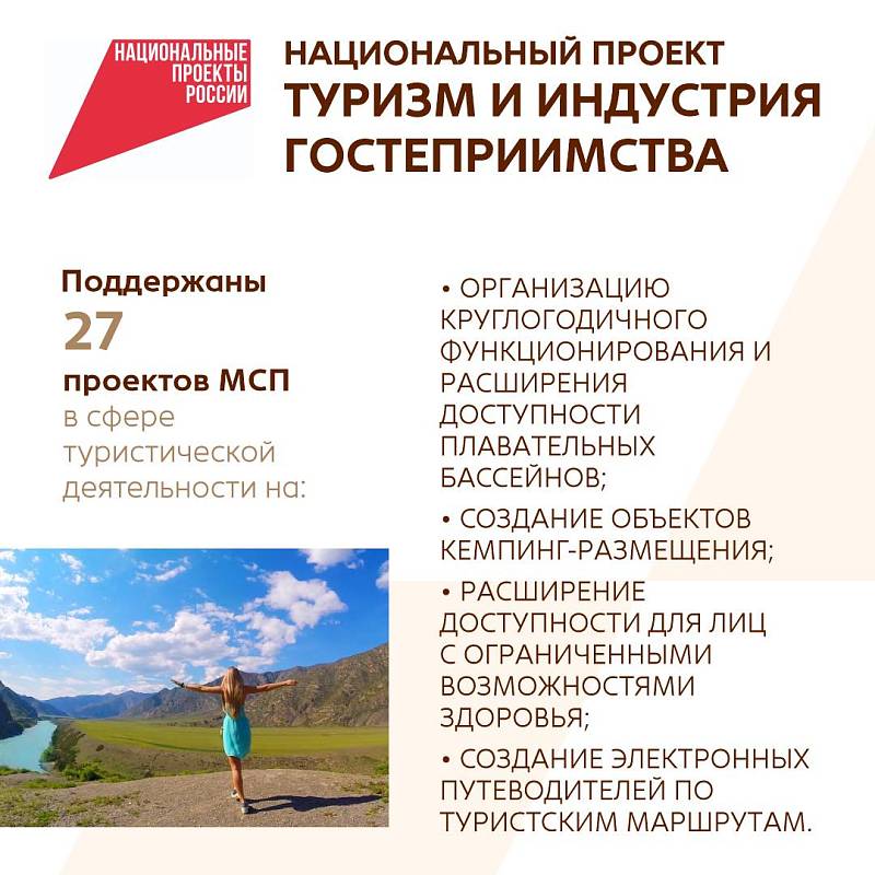 По нацпроекту в регионе поддержано 27 проектов малого и среднего предпринимательства. Средства выделены на работы по созданию цифрового аудиогида «Голоса Алтая», а также приобретено специальное оборудование для сплавов по рекам и туристическое снаряжение для круглогодичных туров.