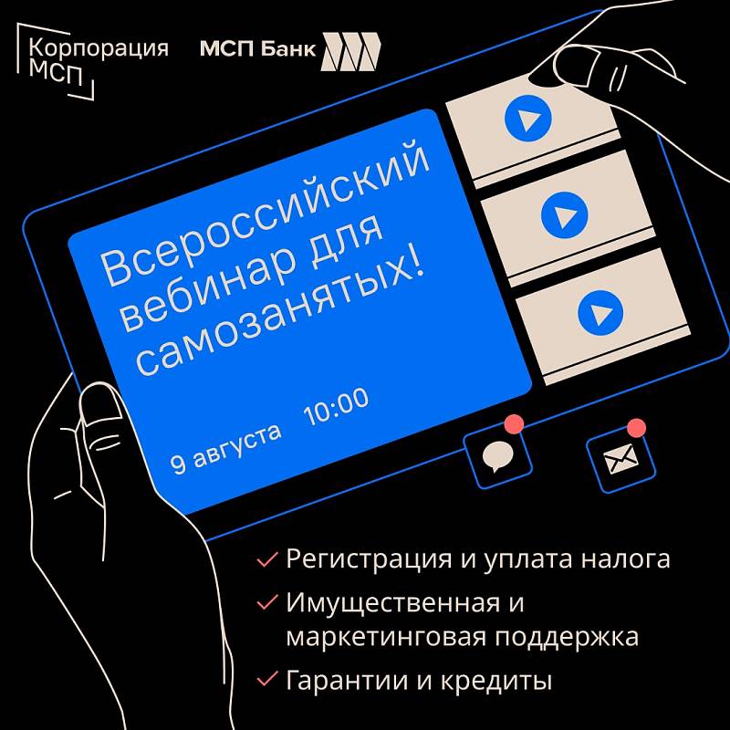 9 августа 2021 г.в 10.00 (мск) планируется проведение очередного вебинара в формате видеоконференцсвязи по мерам поддержки граждан, применяющих специальный налоговый режим «Налог на профессиональный доход» (далее – «самозанятые»), реализуемых органами государственной власти и местного самоуправления, а также АО «Корпорация «МСП».